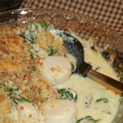 Mouthwatering scallops and spinach, topped off with a rich Parmesan cheese sauce, baked until bubbly and delicious!